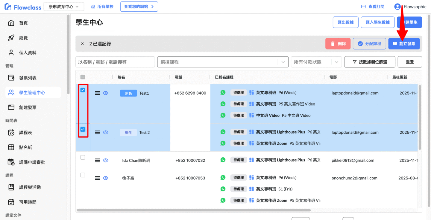 - 在「學生管理中心」中,勾選要一同開立發票的帳戶。