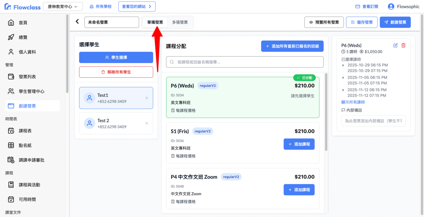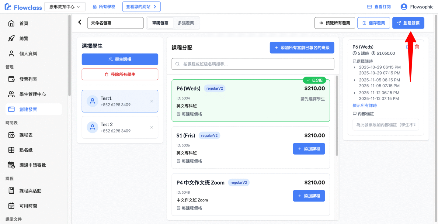 - 點擊 「+ 添加課程」 將該班別加進發票中。
