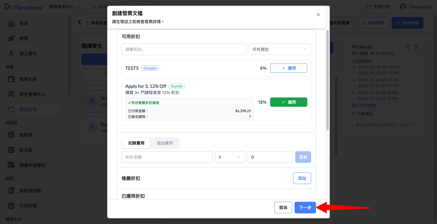 - 當課程符合優惠資格(例如購買三個課程享 12% 折扣),系統會自動顯示折扣資訊。