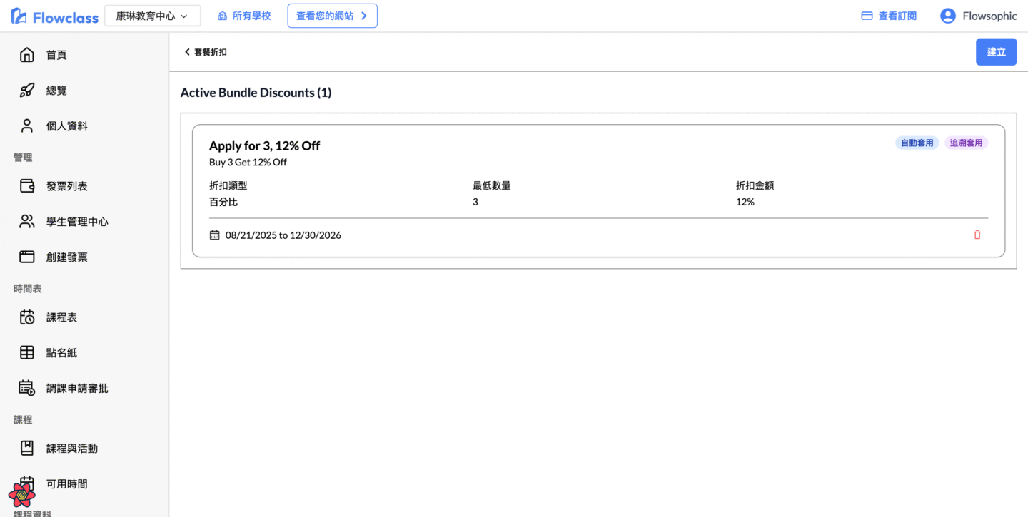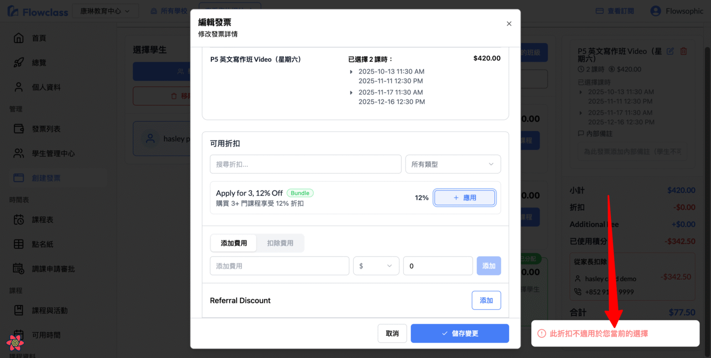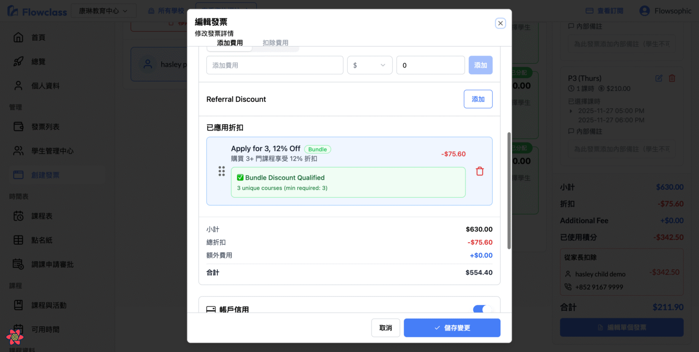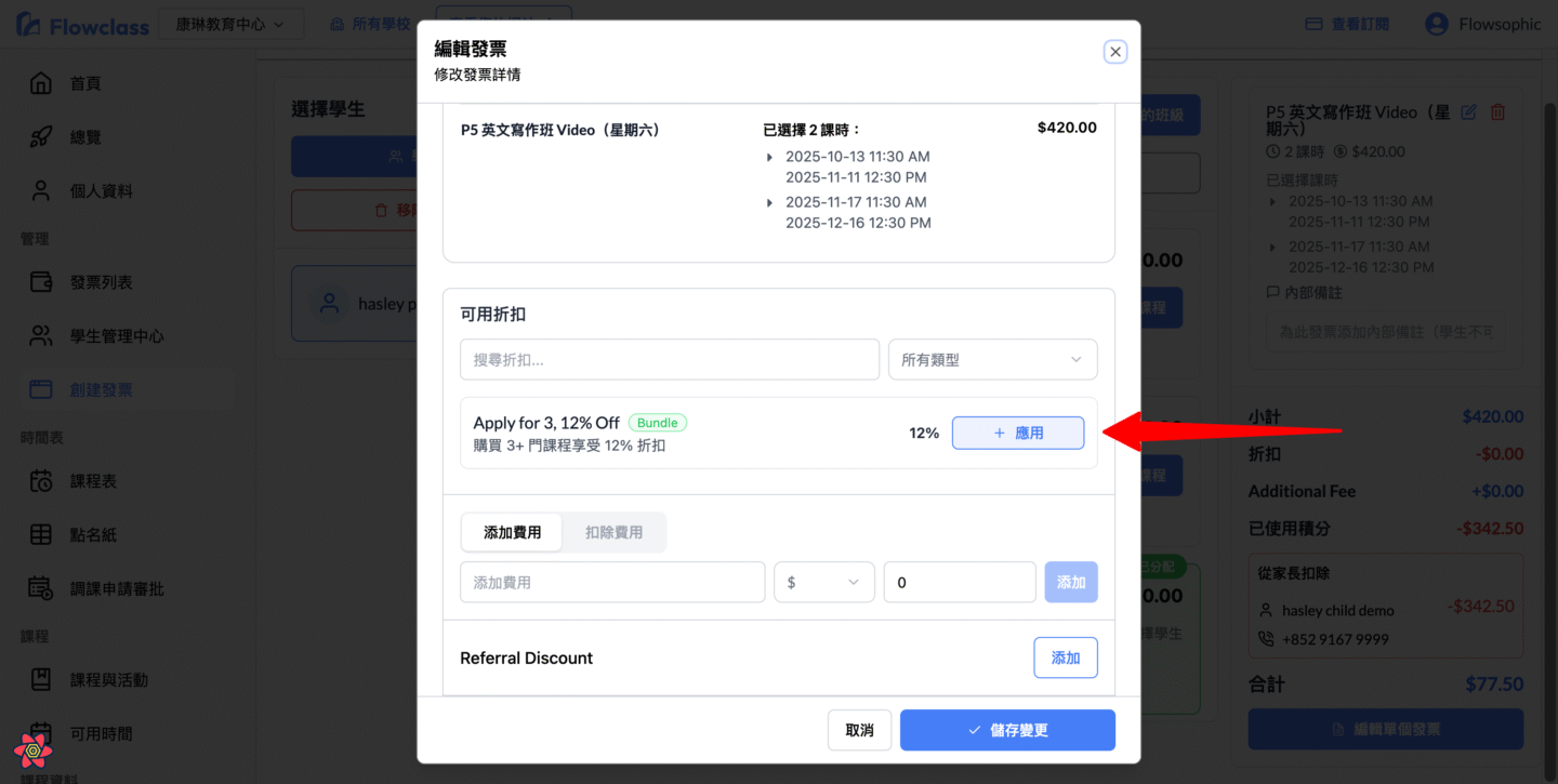 在建立恆常班發票後,管理員還可以使用 套餐折扣(Bundle Discount) 功能,為學生自動套用多課程優惠。