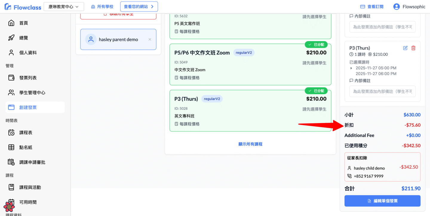 - 若學生的報課記錄達到最低課程數量,折扣將在發票中自動顯示。
