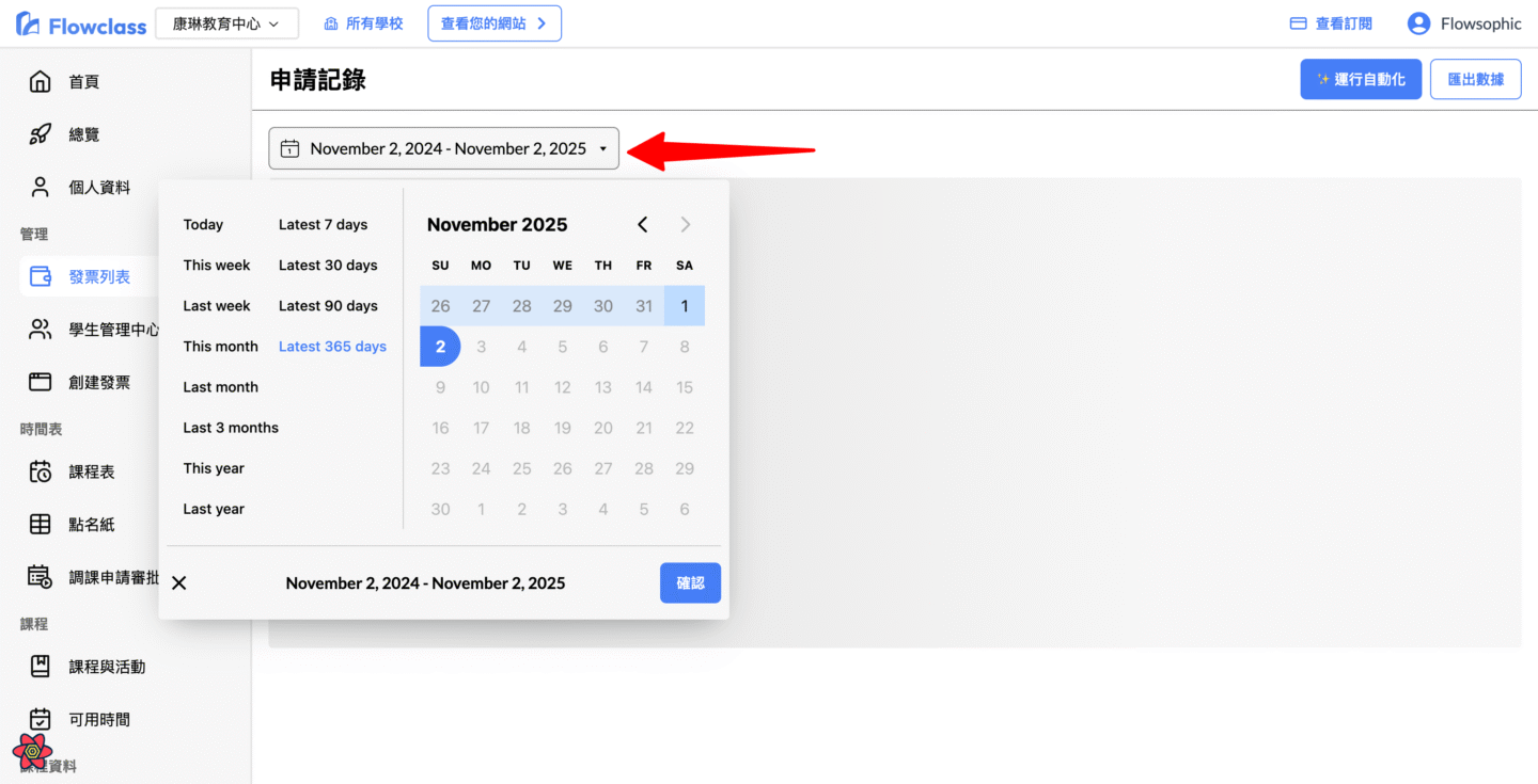 點擊日期篩選欄位,選擇較長時間範圍(例如「過去一年」或「最近 90 天」),即可查看更早建立的發票。