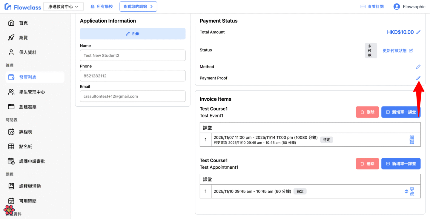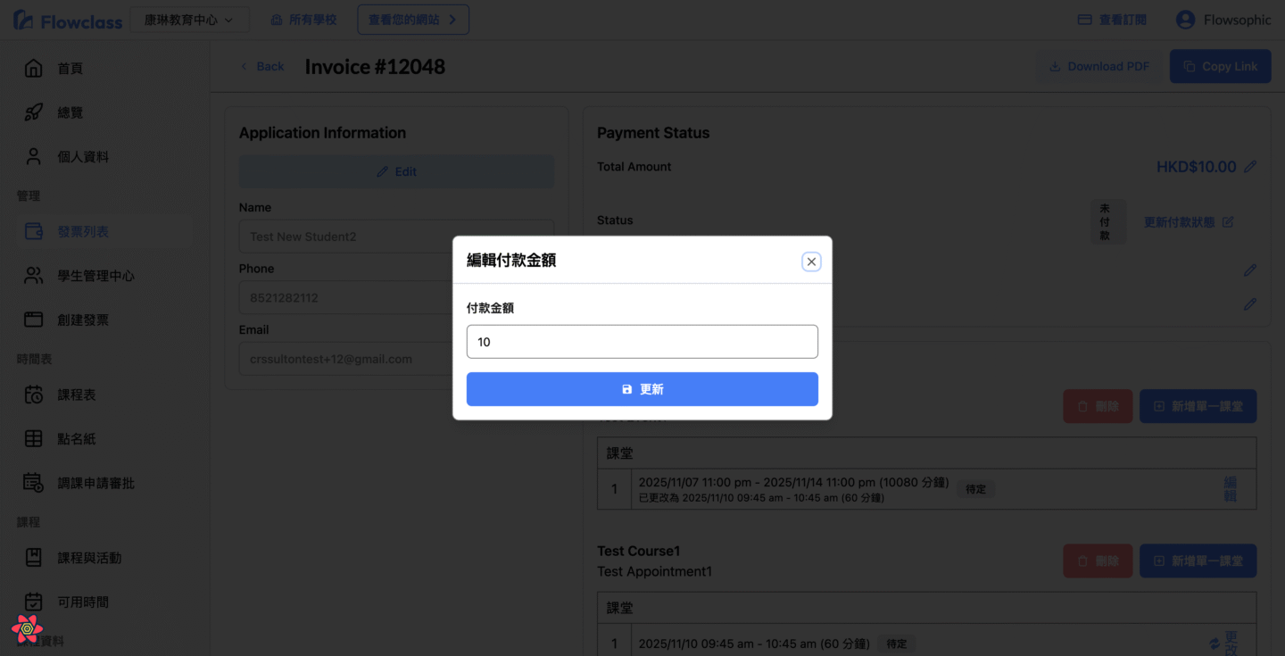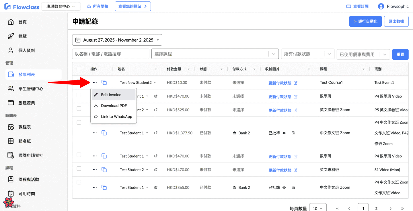 透過此步驟,管理員可快速檢視、修改與追蹤所有學生發票,確保收費紀錄清晰準確。