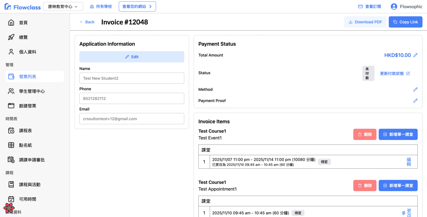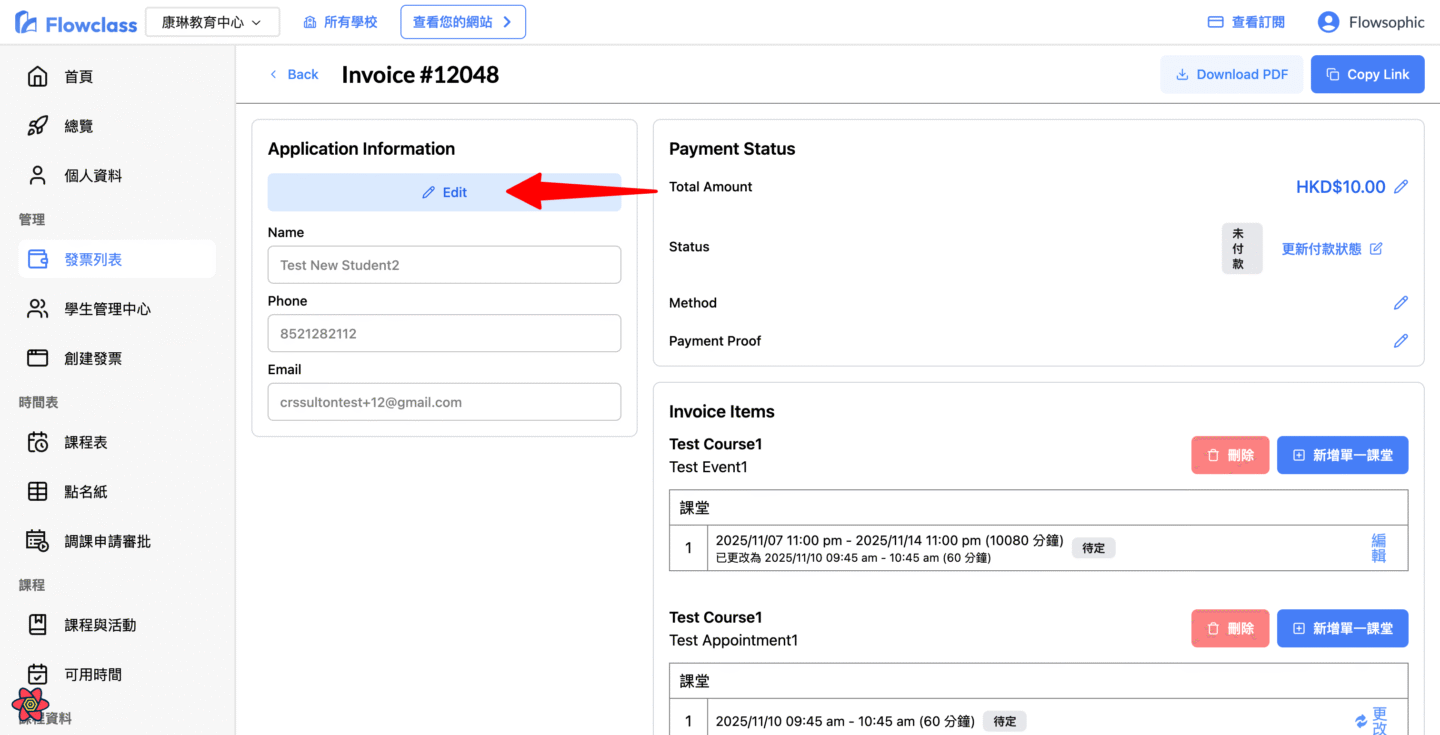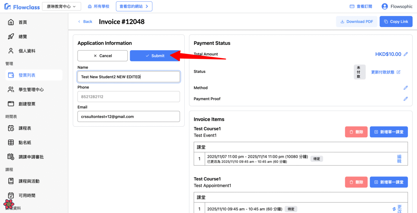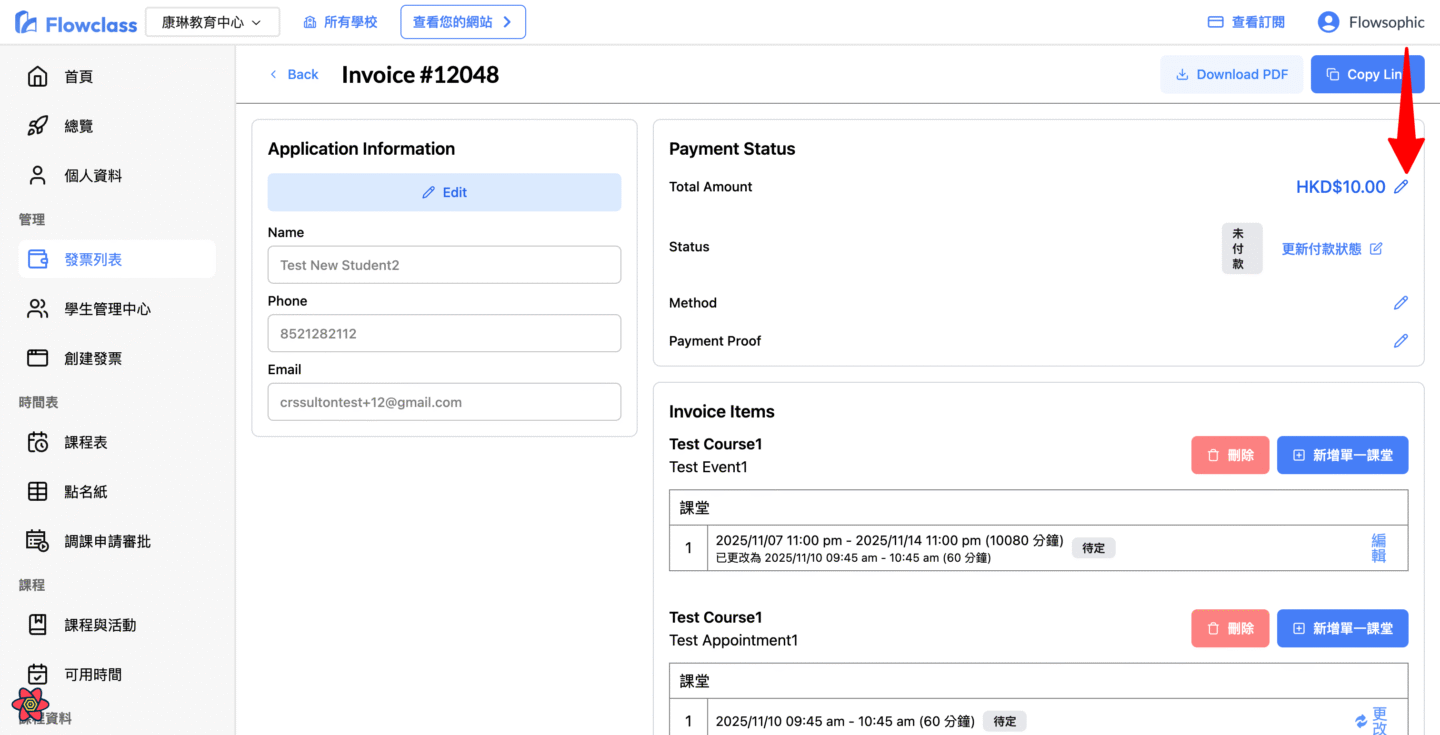 透過此步驟,管理員可快速檢視、修改與追蹤所有學生發票,確保收費紀錄清晰準確。