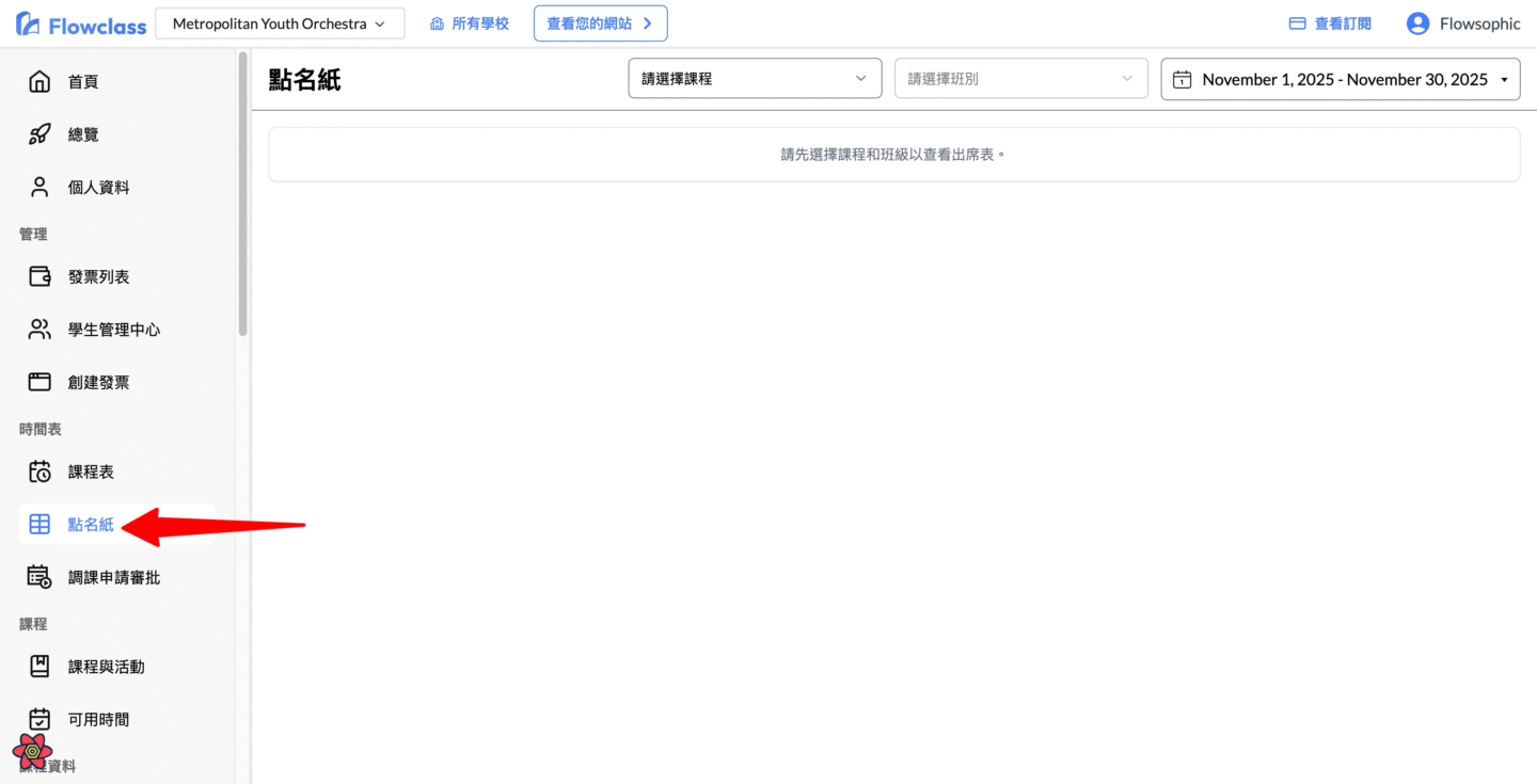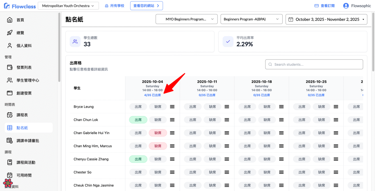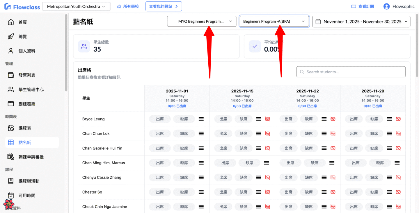 本教學說明如何使用 Flowclass 的「點名紙」功能,詳細操作從進入頁面、選擇課程班別、設定日期篩選,到標記與修改學生出席狀態。