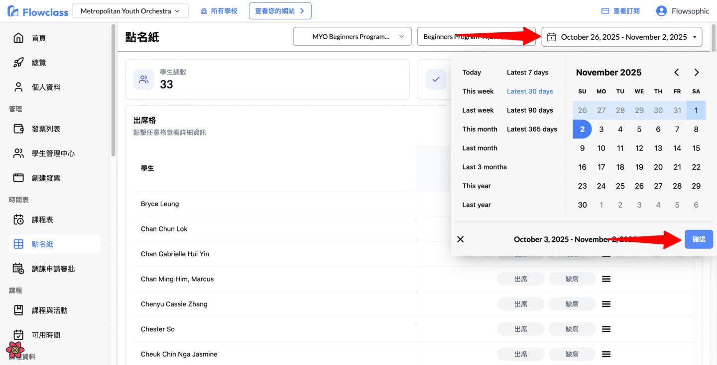 若您未看到預期課堂或學生名單,請確認日期篩選範圍。