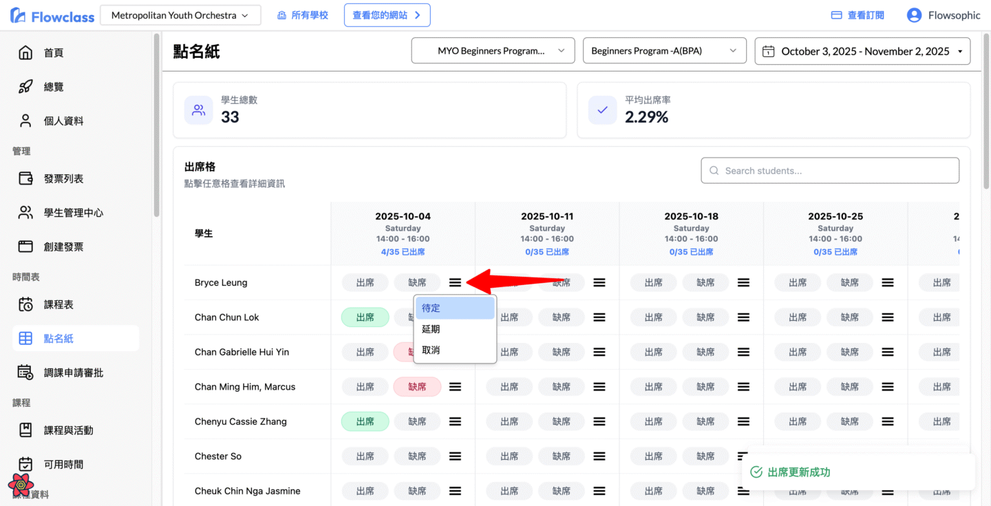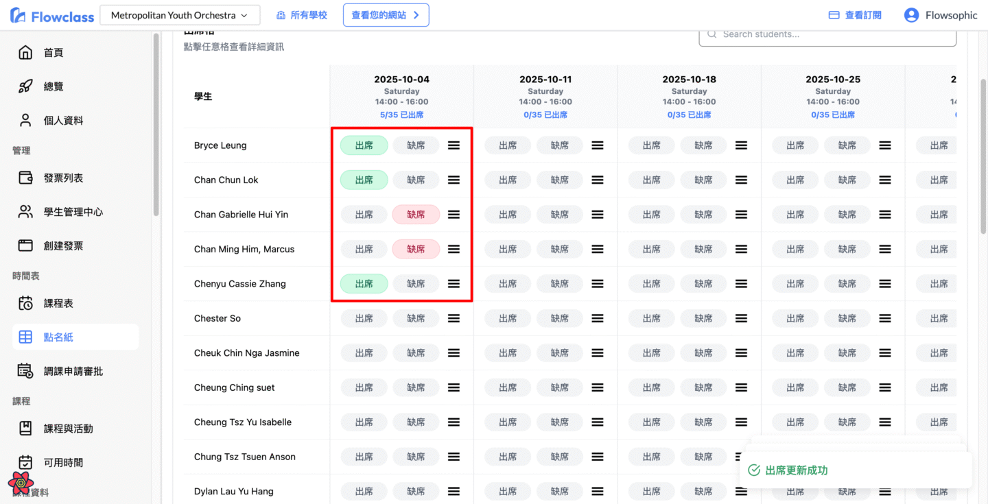 - 系統會立即儲存,顯示「出席更新成功」通知。