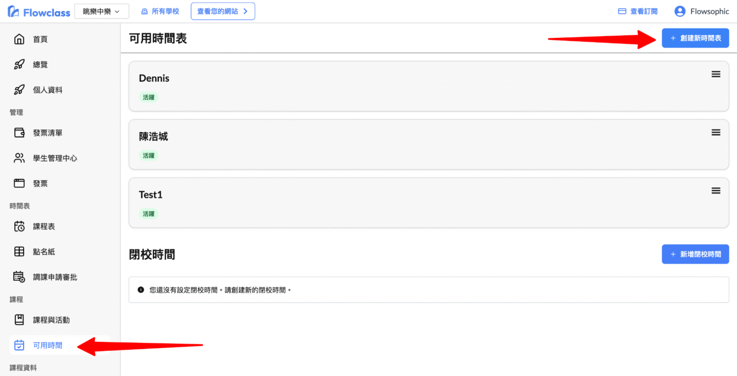 「可用時間表」代表導師可以上課的時間,而「關校時間」則是學校暫停上課的日期(例如公眾假期)。