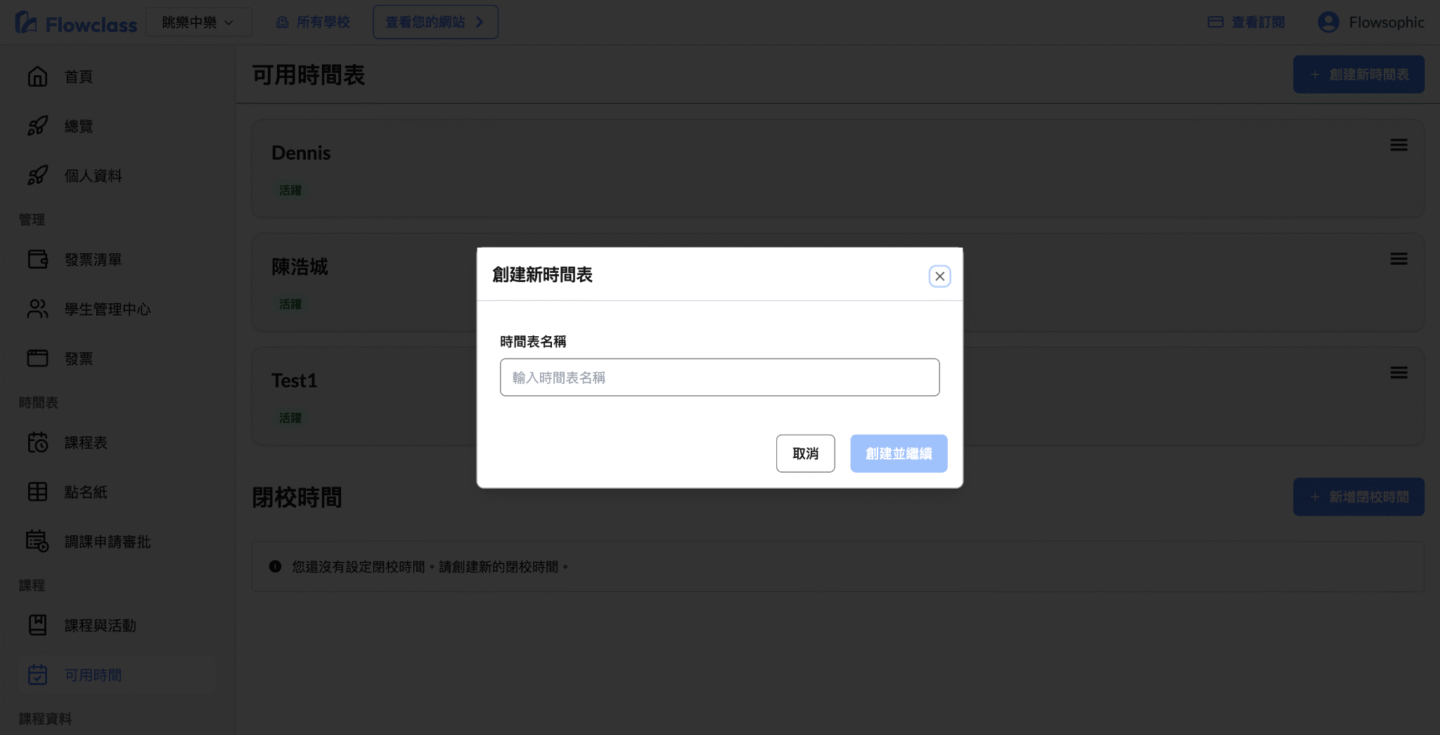 當您為導師建立課程時,若導師尚未設定「可用時間表」,系統將無法自動安排課堂時間。透過建立「可用時間表」,您可以設定導師可授課的日期與時段,方便之後自動匹配課程排程。