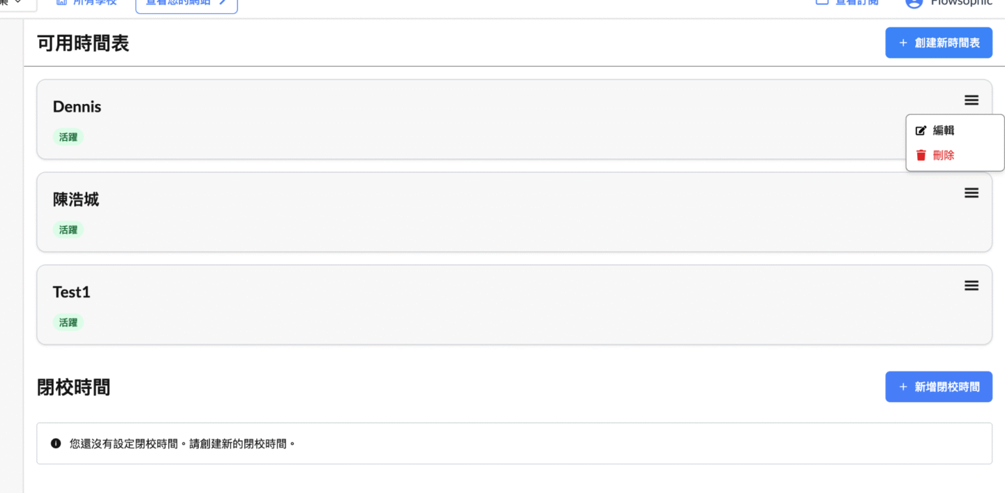 此頁面會顯示目前所有可用時間表的清單。每個時間表通常以導師名稱命名,並標示為「活躍」狀態。