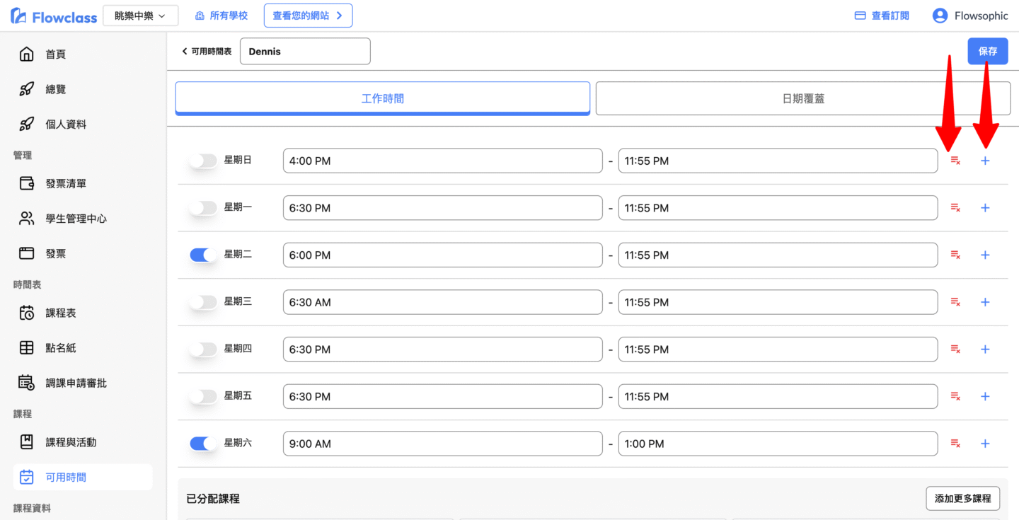 - 若想取消當天授課,可直接將「此日期有可用時間?」開關關閉。