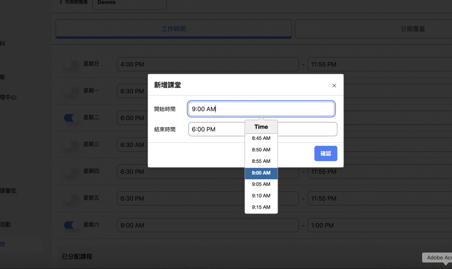 設定完成後,點擊右下角的 「確認」 按鈕,即可將新時段加入可用時間表中。