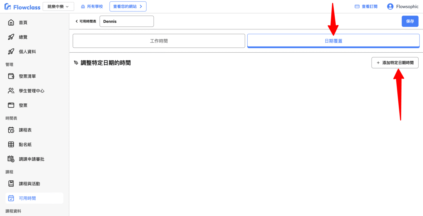 「日期覆蓋」功能可讓學校或導師針對特定日期設定例外的可用時間。
