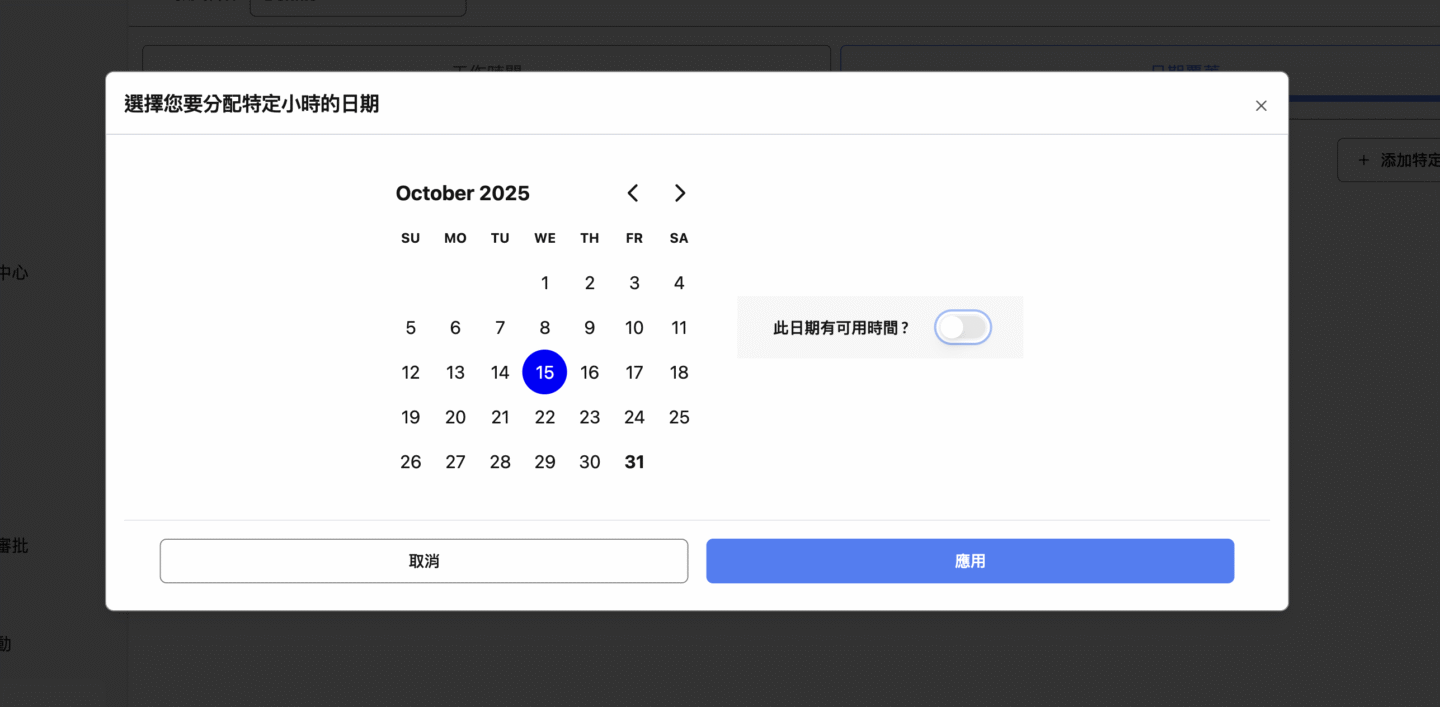 - 若導師原本每週三全天上課,但某週三需出差,可點選該週日期並關閉「此日期有可用時間?」開關,系統將自動停用當天可用時段。