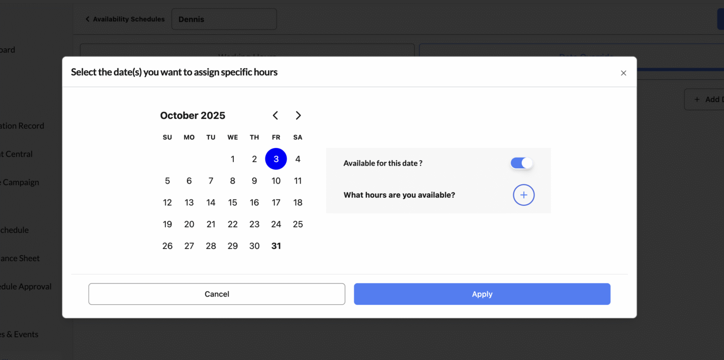 啟用此功能後,系統會暫時覆蓋導師原本設定的每週可用時間,以該日期的設定為準。這可確保課程安排更靈活,同時避免因導師臨時變動而發生重疊或錯誤預約。